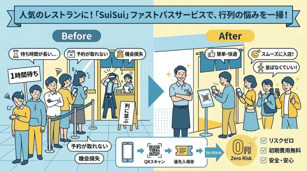 そんな繁盛店の悩みを解決するのが、行列スキップ型優先入店サービス「SuiSui」です。最大の魅力は、店舗側が抱える金銭的リスクを徹底的に排除した「完全成果報酬型」の料金体系にあります!