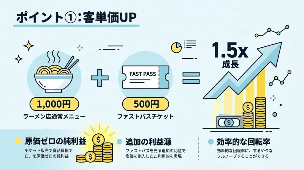 飲食店の売上は「席数×回転数×客単価」で決まりますが、物理的な席数やスタッフの体力には限界がありませんか?SuiSuiを導入すれば、お客様が席に座る前の「並んでいる段階」でチケットという新たな商品が売れるため、メニュー価格を値上げせずに客単価をグッと引き上げられます! ラーメン1杯1,000円のお客様が500円のファストパスを購入すれば、実質的な客単価は1.5倍に跳ね上がります!しかも食材原価が一切かからないため、チケット売上の店舗受け取り分は「すべて純利益」になるのです!売上高だけでなく利益率を劇的に改善し、スタッフへの還元や店舗修繕費など、経営の選択肢を大きく広げましょう!