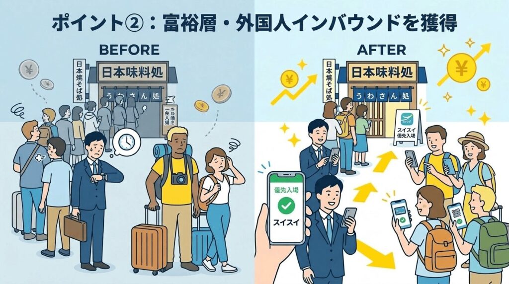 行列店が最も取り逃がしているのは、ランチ時のビジネスマンや、旅行日程の詰まった訪日外国人(インバウンド)層というのをご存じでしょうか?彼らは「限られた時間を節約して確実に名店の味を楽しむこと」に価値を感じいるので、タイパが上がるなら追加料金を支払うことに全く抵抗がありません。