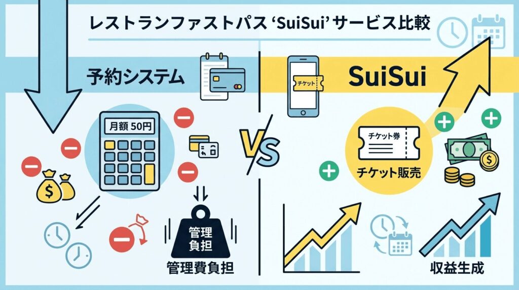 TableCheckやEPARKといった既存の順番待ち・予約システムとの決定的な違いは、「店舗の経費になるか、売上になるか」という点です。既存システムは列を整理し離脱を防ぐための「販管費(コスト)」であり、毎月数万円の固定費が発生します。一方、SuiSuiはチケット販売という新たなキャッシュポイントを生み出す「売上原資」です。導入の目的が「管理」ではなく「収益化」であるため、費用対効果(ROI)が圧倒的に高く、店舗の利益を純増させる直接的な利益になるのが最大の強み。