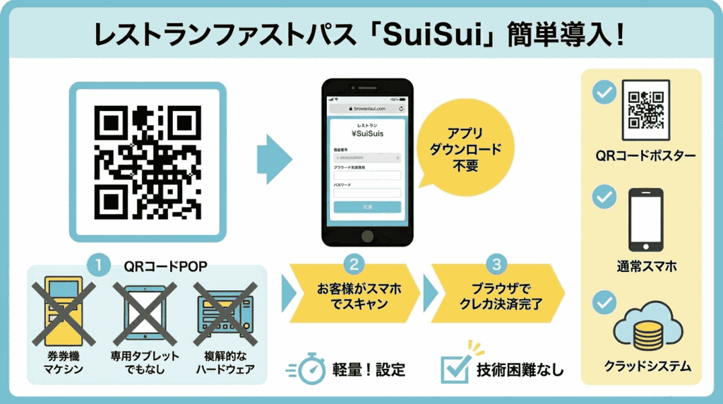 高額な自動発券機や、各テーブルへの専用タブレットの設置などは一切必要ありません。SuiSuiのシステムは、お客様自身のスマートフォンと、店舗側が用意するQRコードの掲示のみで完結するクラウド型のサービスです。 店頭に専用のPOPを掲示するだけで準備は完了。お客様はアプリのダウンロードすら不要で、QRコードを読み込み、ブラウザ上でクレジットカード決済を行うだけでファストパスを発行できます。店舗側は手持ちのスマートフォンやタブレットの管理画面を確認するだけで、スムーズな誘導が可能です。