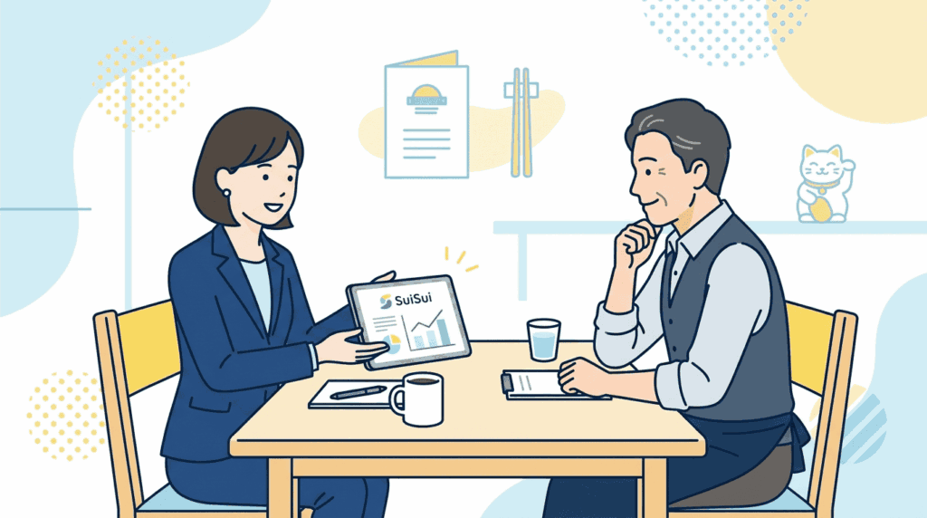 ITツールの導入に不安を抱える店舗様でも安心してスタートできるよう、SuiSuiでは徹底的な人的サポートを実施しています。システムのアカウント発行や初期設定はもちろん、店頭に掲示する専用POPの作成まで、すべて専任のサポート担当者が代行します。 さらに、現場スタッフへの操作トレーニングを実施するだけでなく、導入初日には担当者が実際に店舗へ赴き、現地での立ち会いサポートまで行います。マニュアルを渡して終わりのIT企業とは異なり、現場のオペレーションに馴染むまで徹底的に伴走し、確実な定着を約束します。