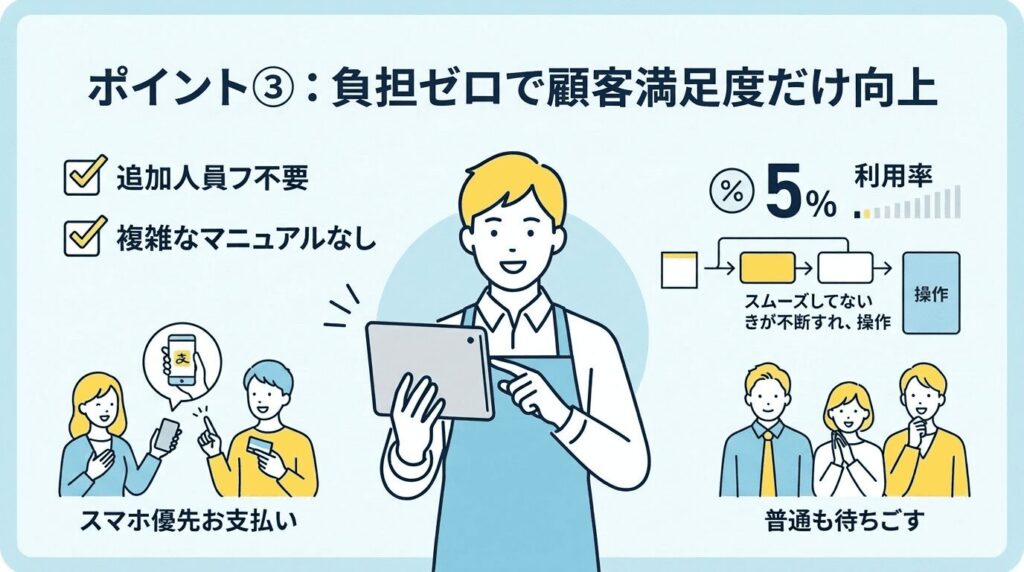 「行列で諦めて帰るお客様を救いたくて導入!今では並ぶ方の5〜10%が利用してくれます!店舗負担ゼロで純利益になり、懸念していた批判もなく『便利だね!』と喜ばれるので、本当に導入して大正解でした!」